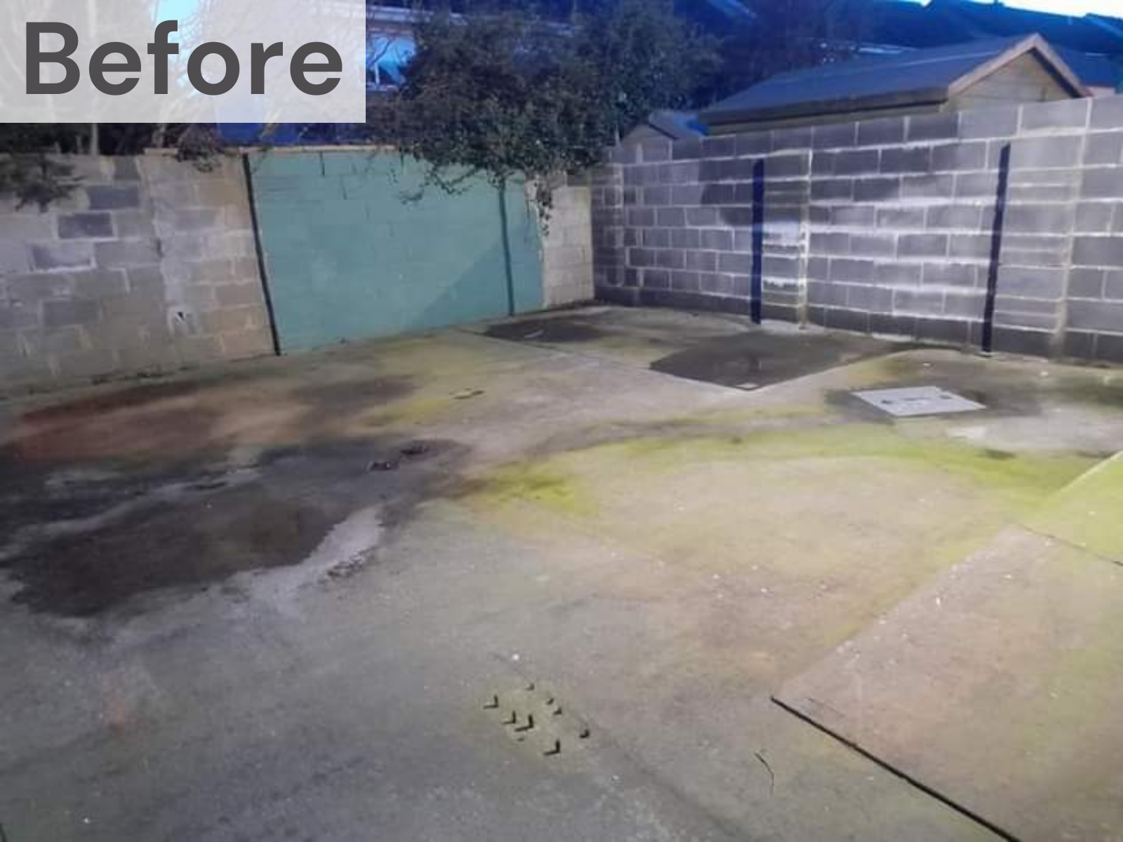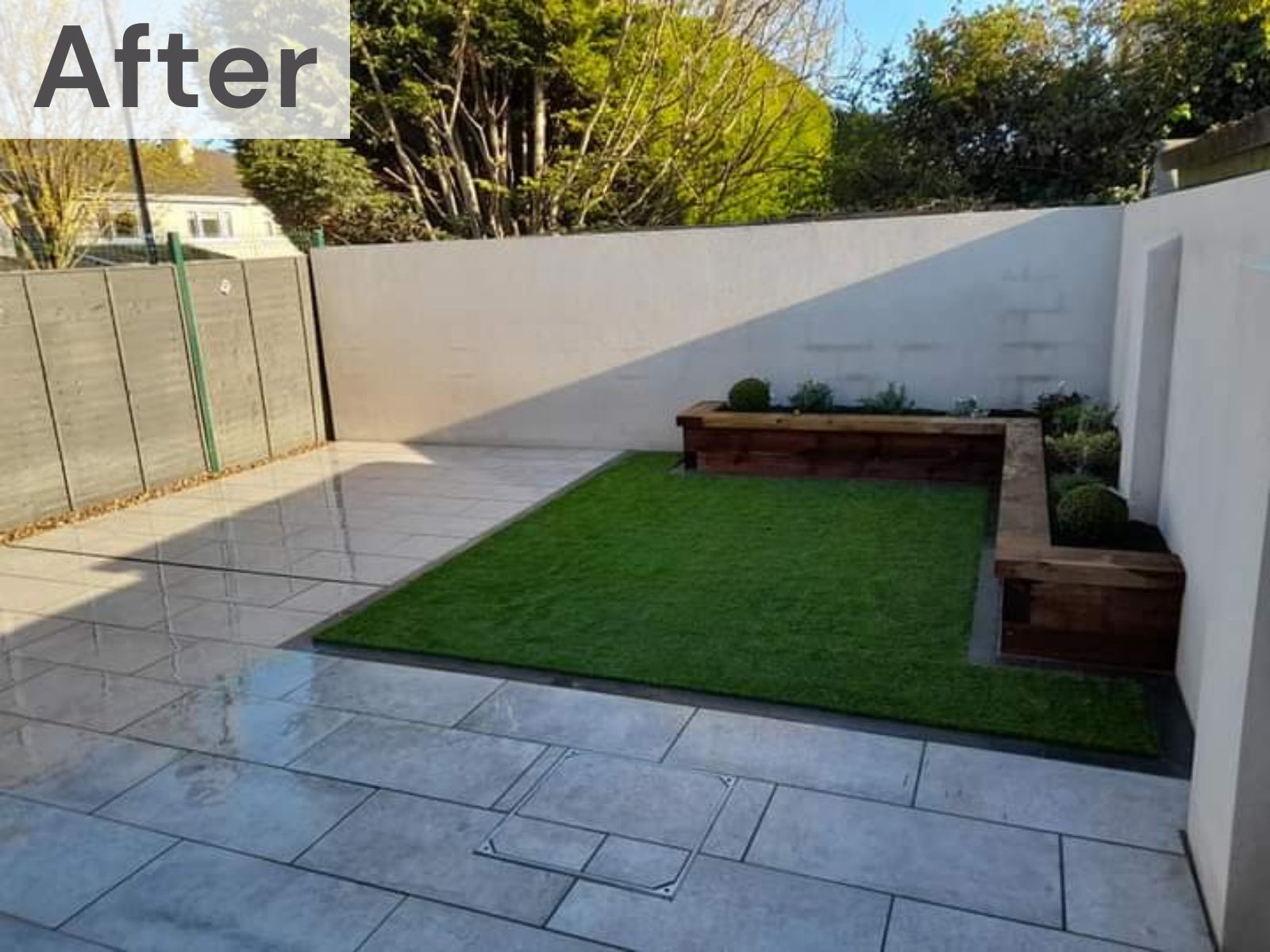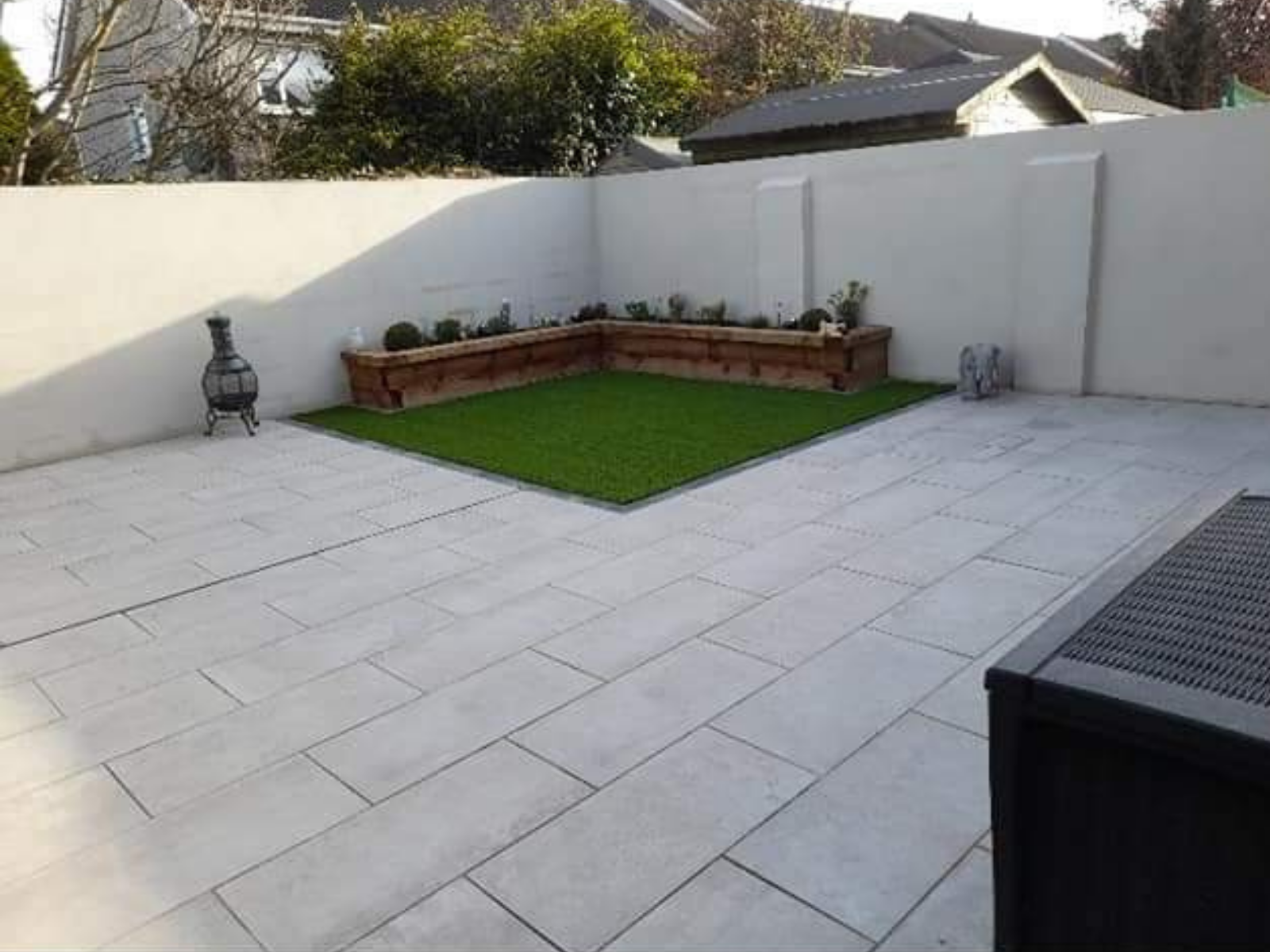 Installation of Grigio porcelain paving 800×400, premier artificial grass and a sleeper flowerbed feature. Walls finished with a coloured lime plaster that brightens up the space