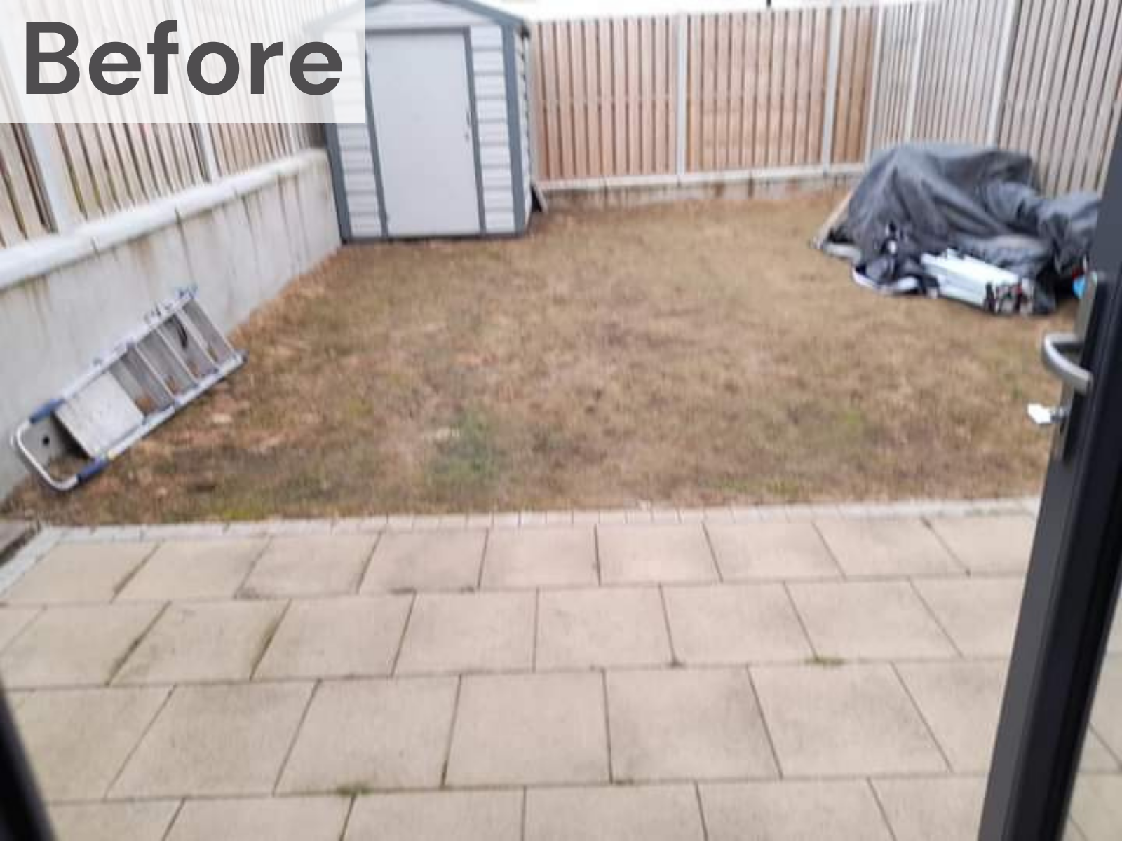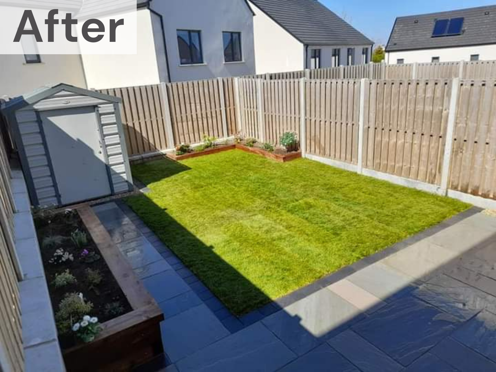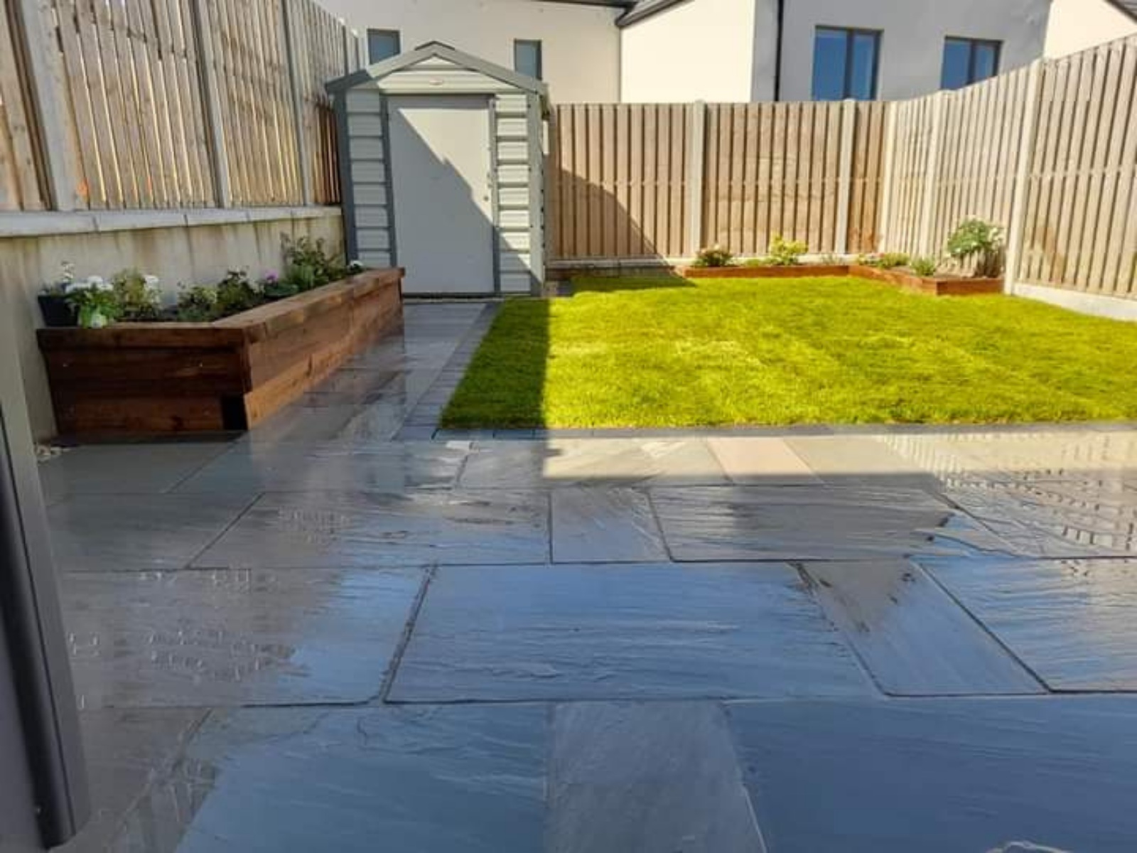 New roll out turf lawn installed with Kandla grey sandstone paving and a sleeper flower bed with planting from Tully Nursery