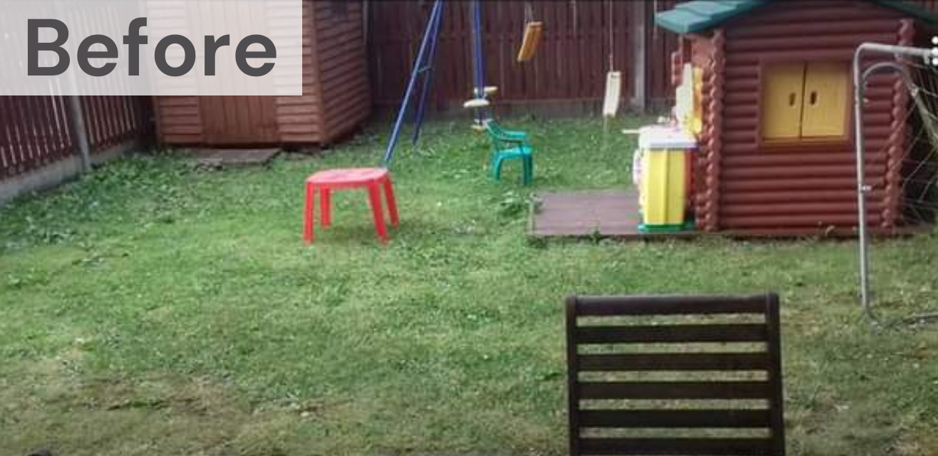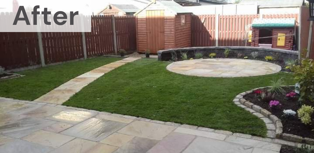 To fit the clients needs, our team maximized this outdoor space by splitting the garden level with Connemara walling and installing a sandstone patio and new lawn