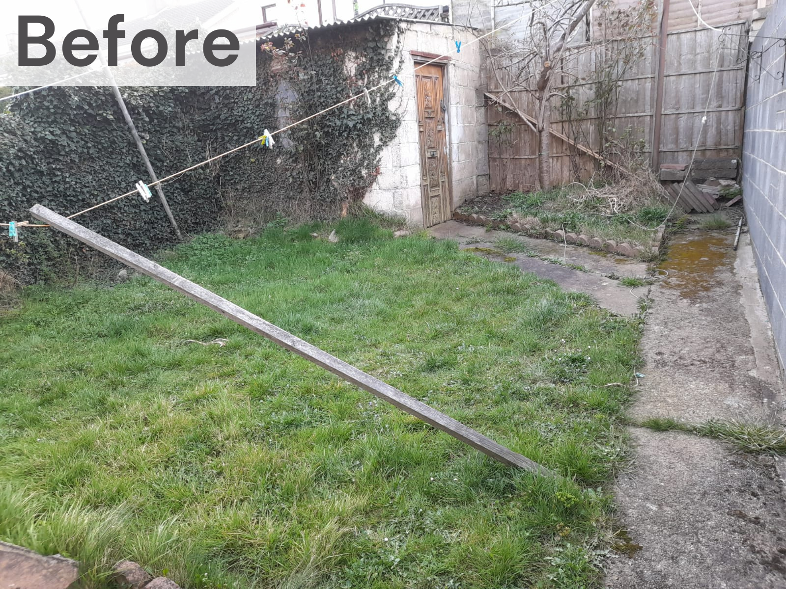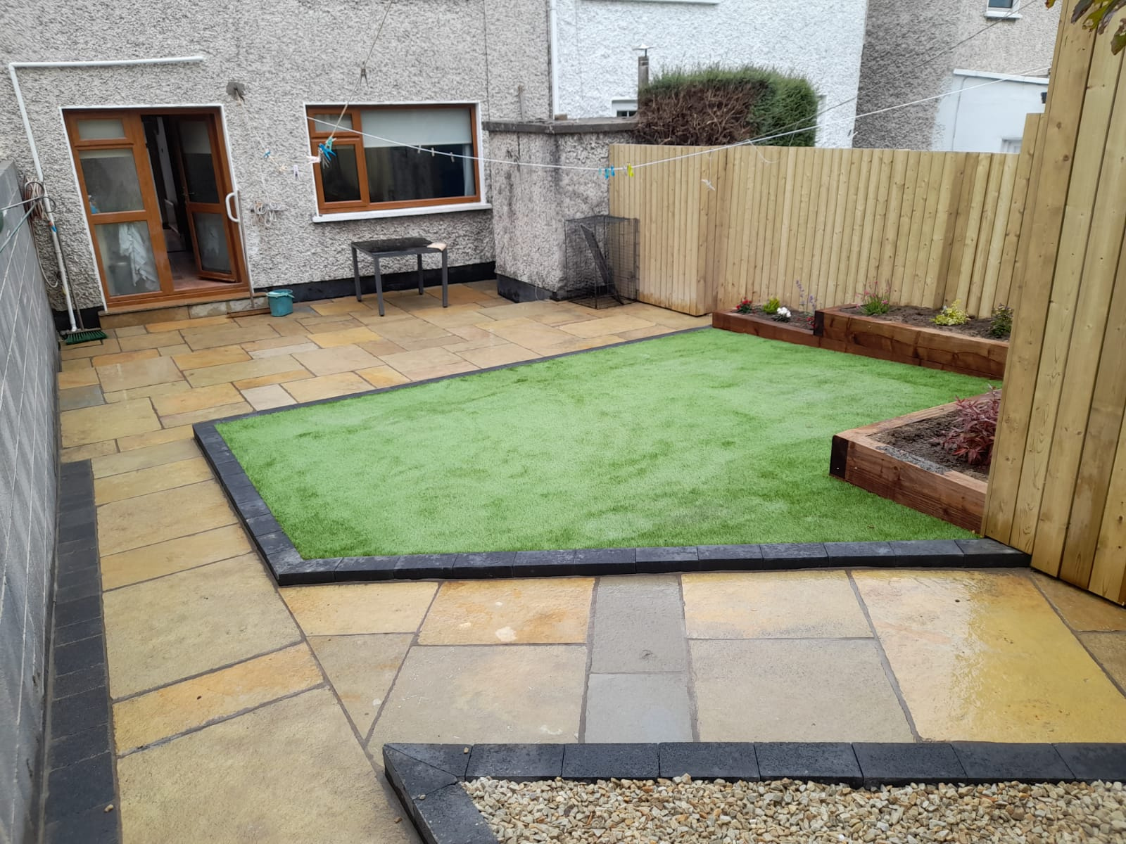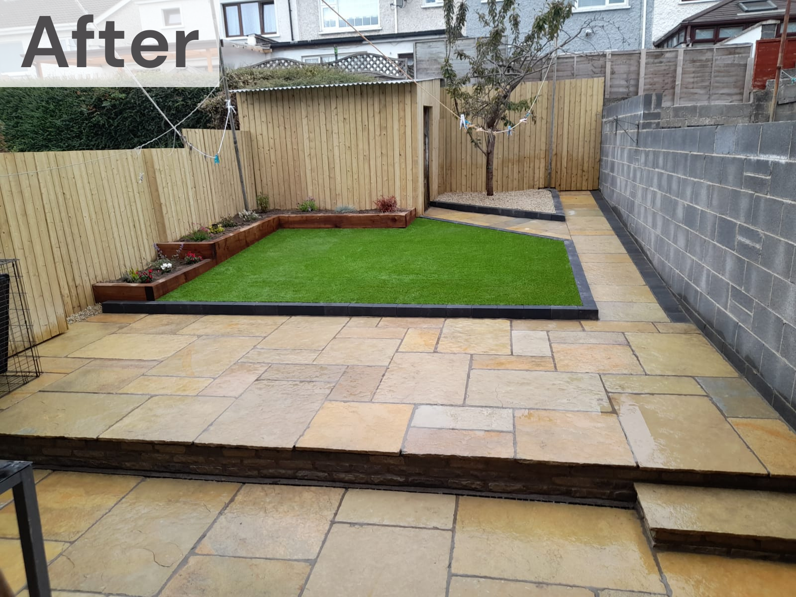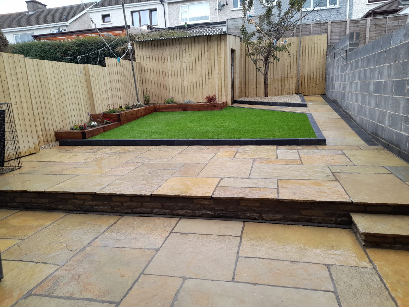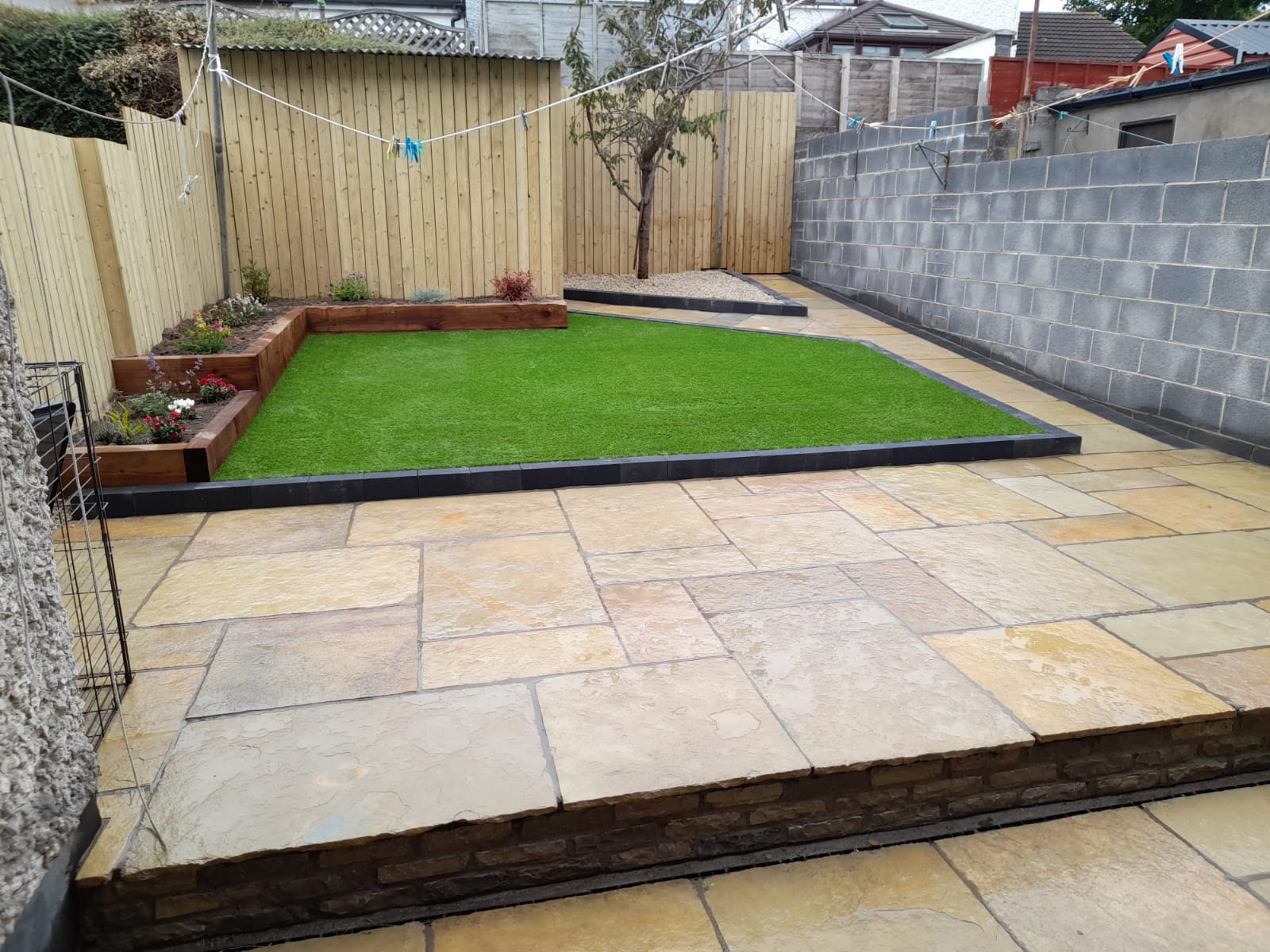 This split level garden held fantastic potential. Our team worked with the client to create this bespoke design. Artificial lawn installed with borders and the new paving compliment the unique angles of the garden. Matching timber on the shed and fence was fitted along with sleeper flower beds with planting