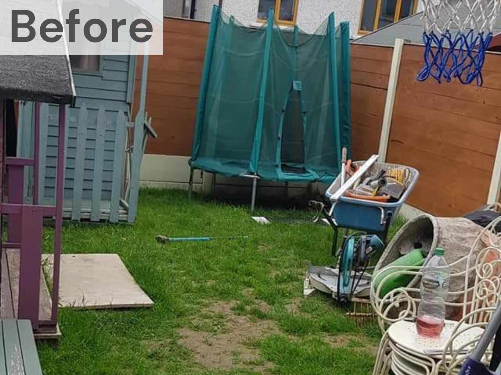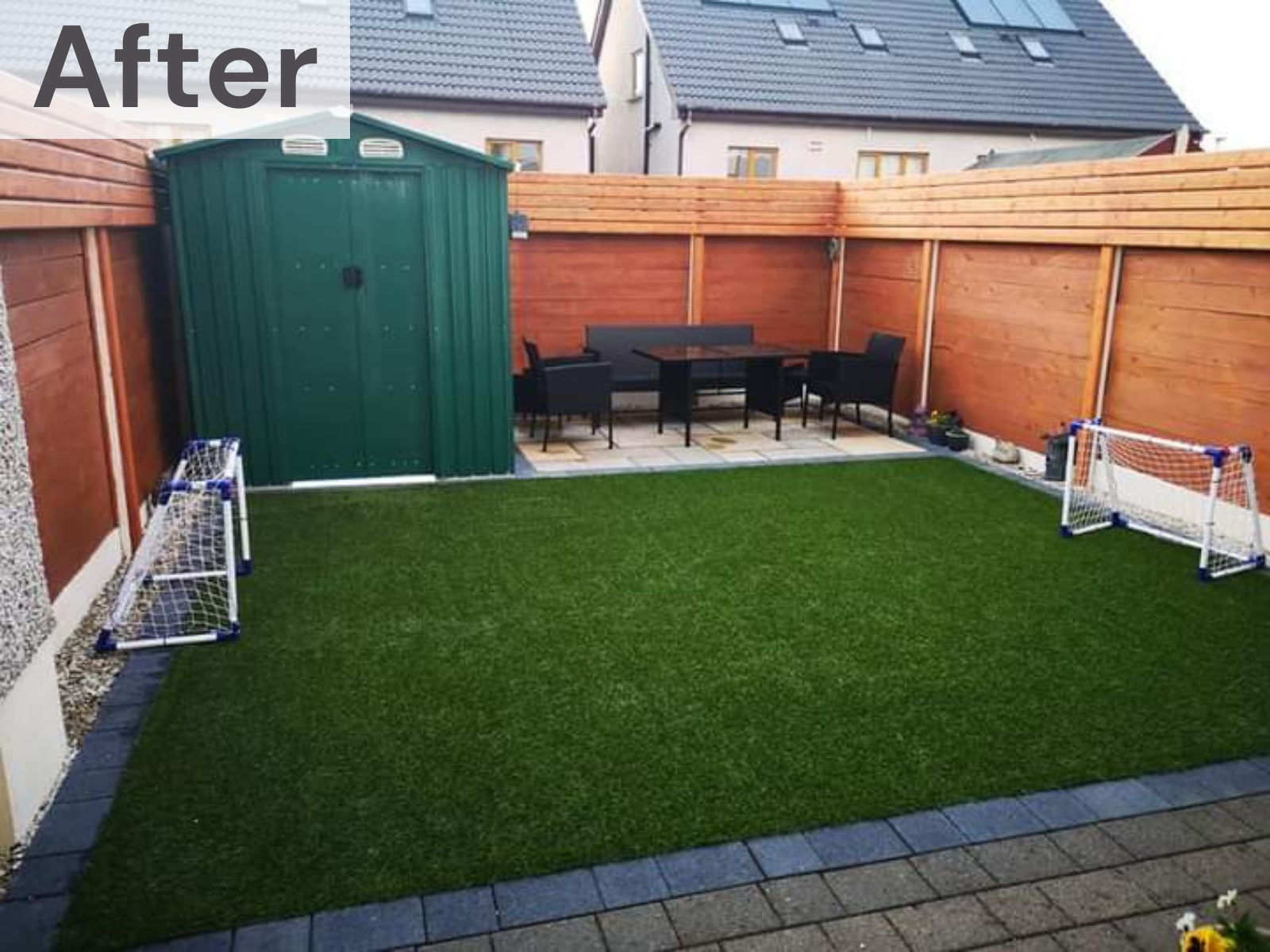 This small and simple makeover was designed to resolve a bad drainage issue due to a sloping garden. Installation of new paving and artificial grass with a border created a tidy adult and kid friendly space to meet the client's needs