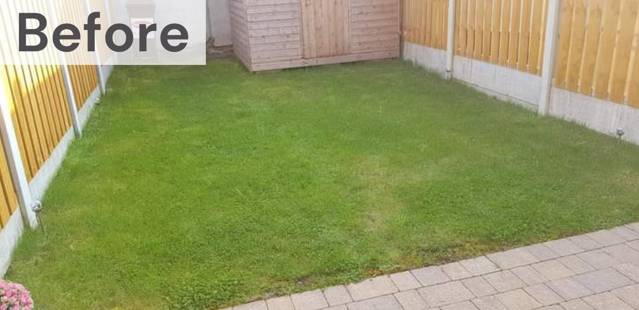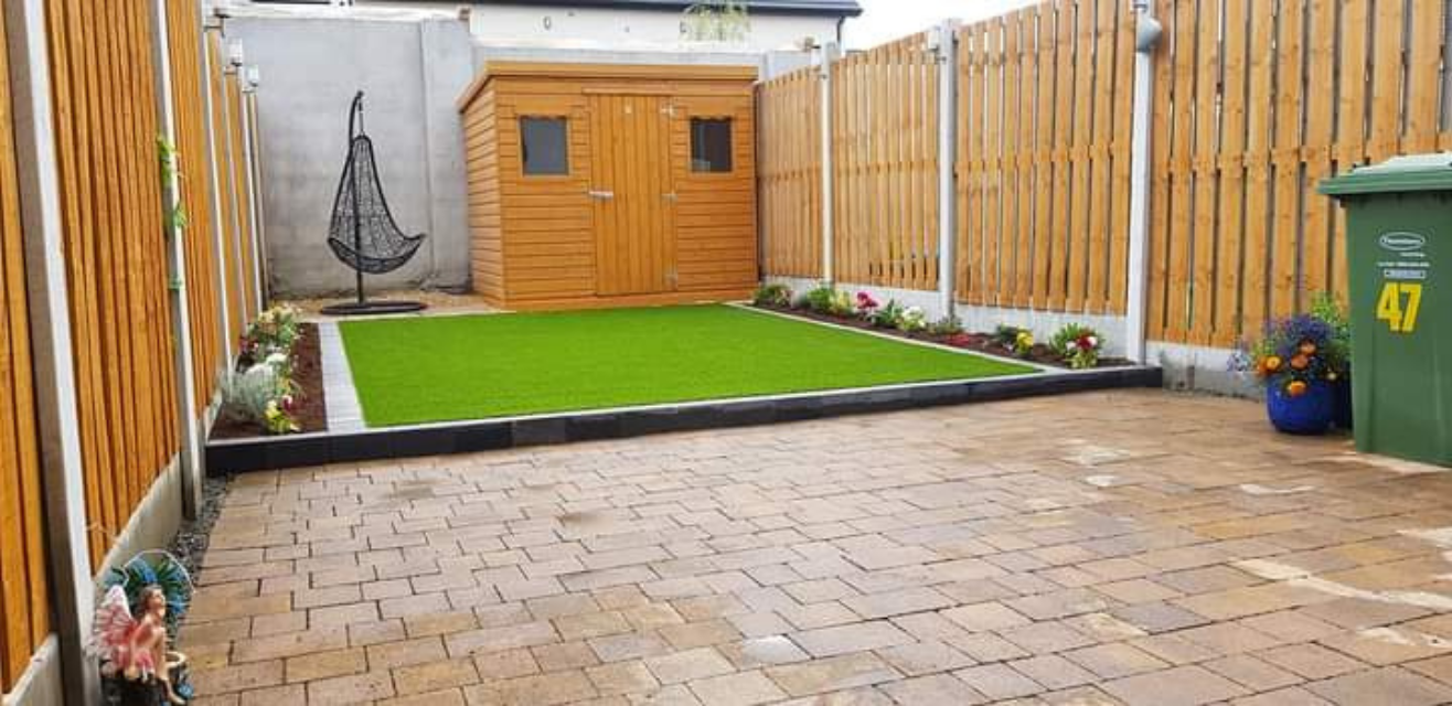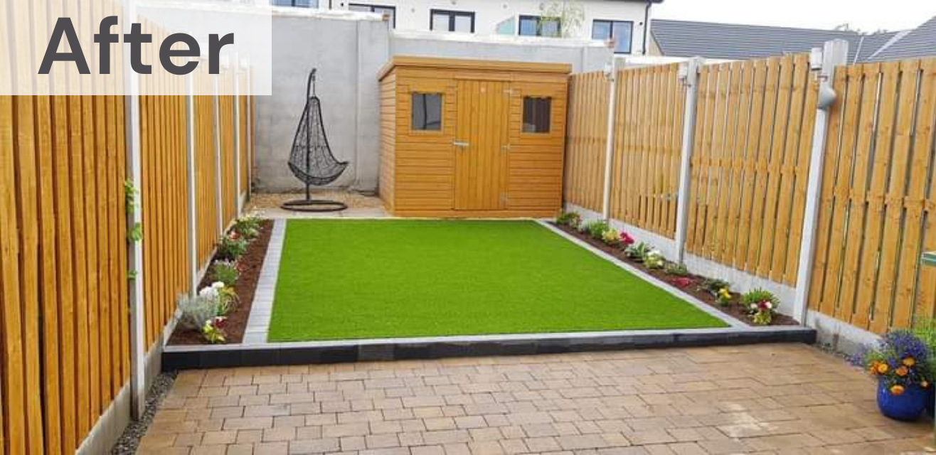 Turf lawn was removed and replaced with a low maintenance artifical grass and Castletorn kerbingmixed summer planting. Our team brightened the space with mixed summer planting