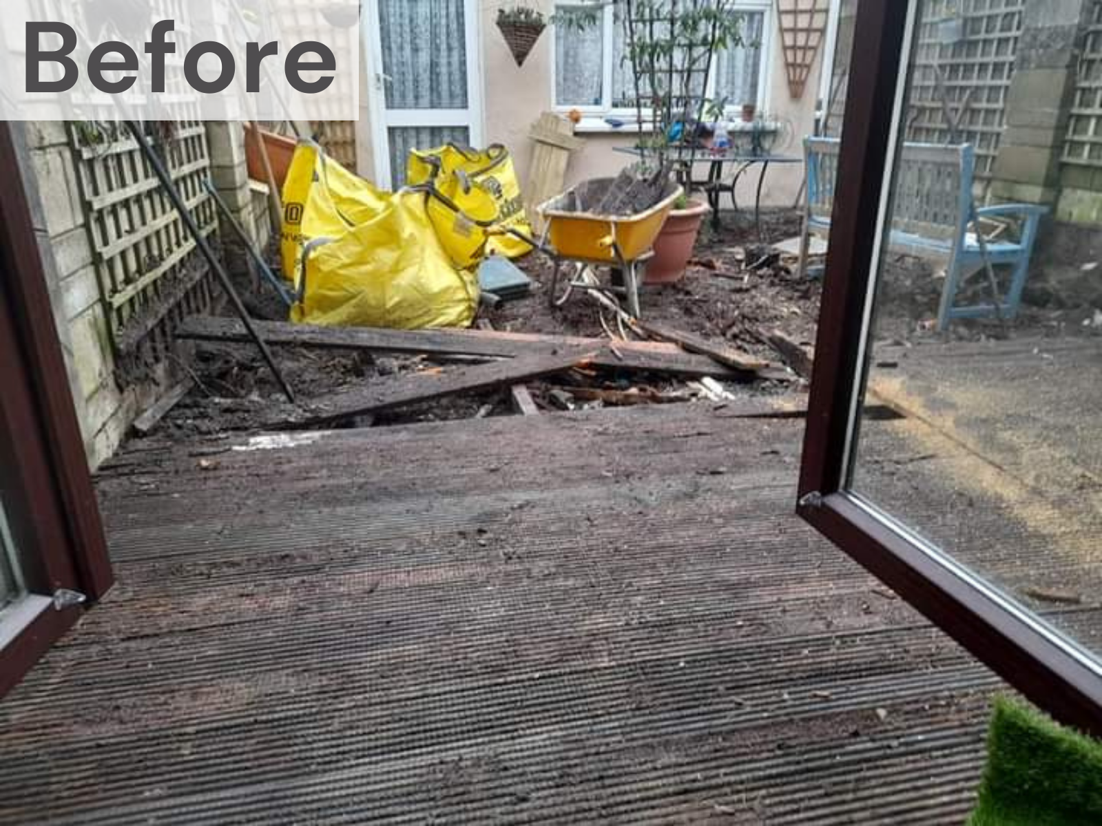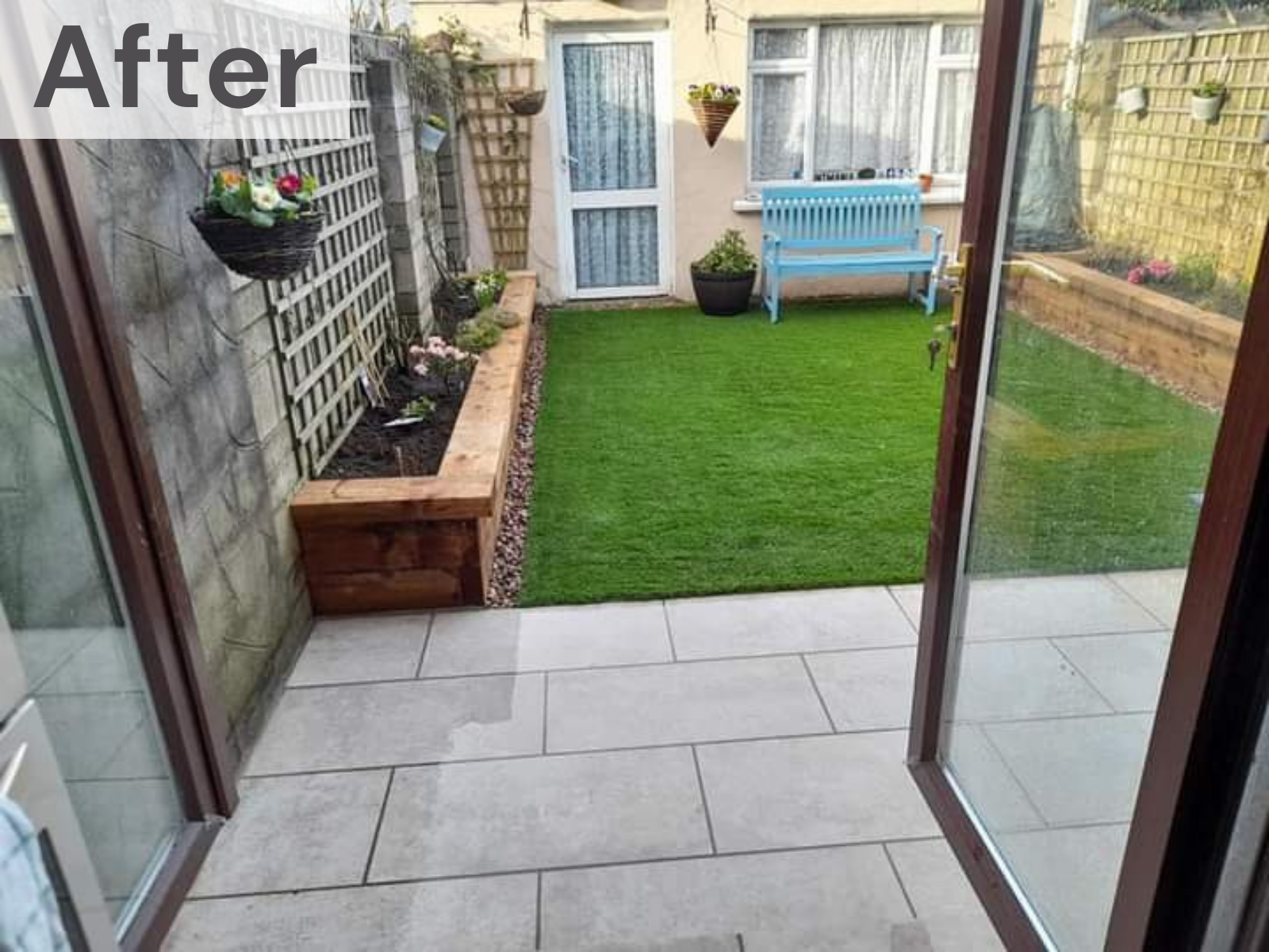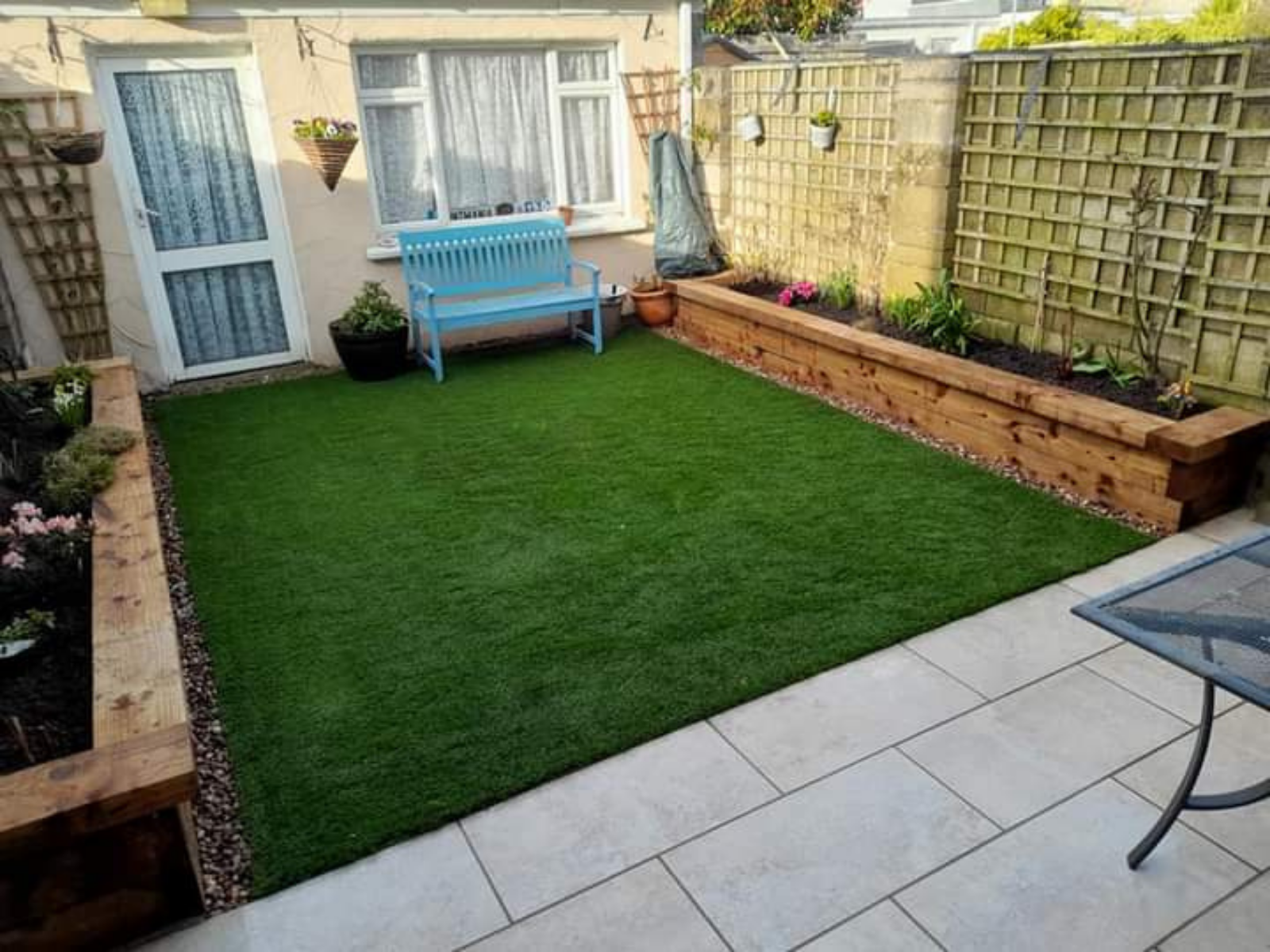 Old decking removed and replaced with beige porcelain paving and Sanctuary Synthetics real artificial grass
