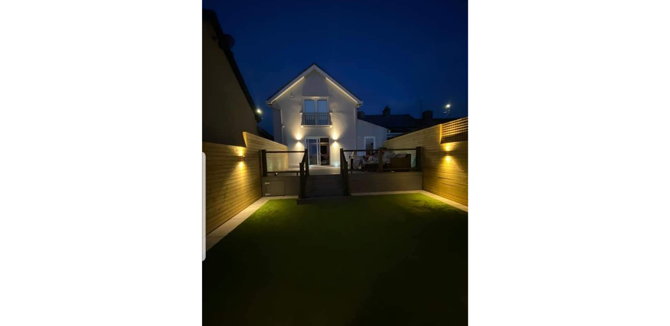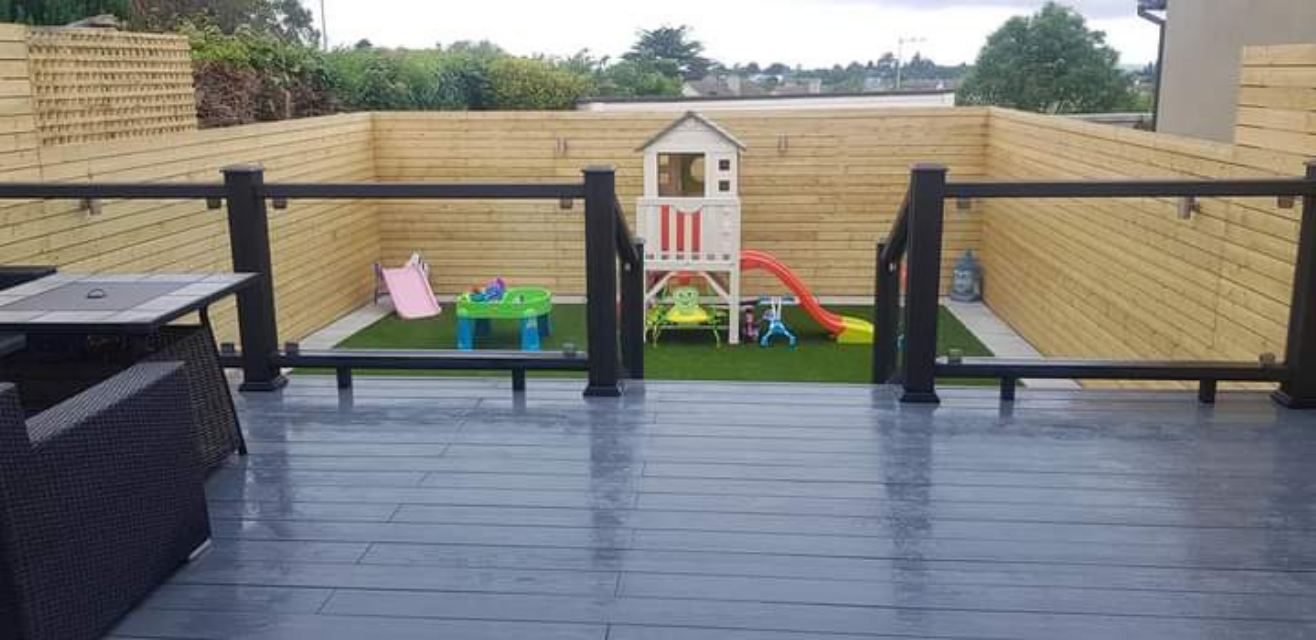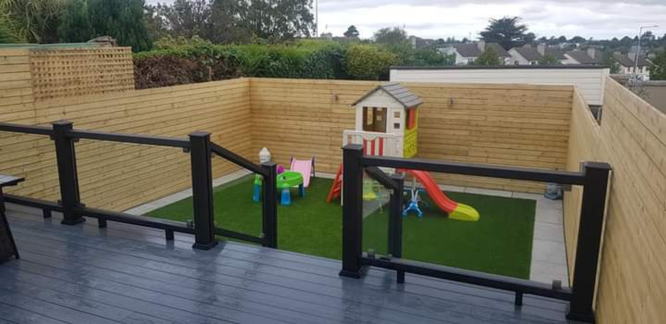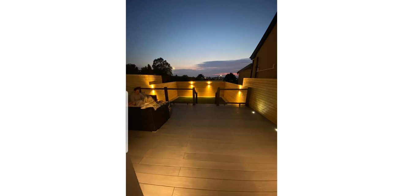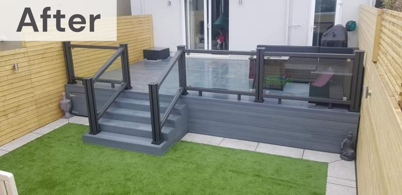 This complete garden transformation features a beautiful Teranna silver grey composite decking with glass balustrade, leading down to Arizona artificial grass with a Grigio porcelain boarder. The fence was supported with new concrete posts and completed with a treated finish and new lighting. ew concrete posts with 4×1 planed