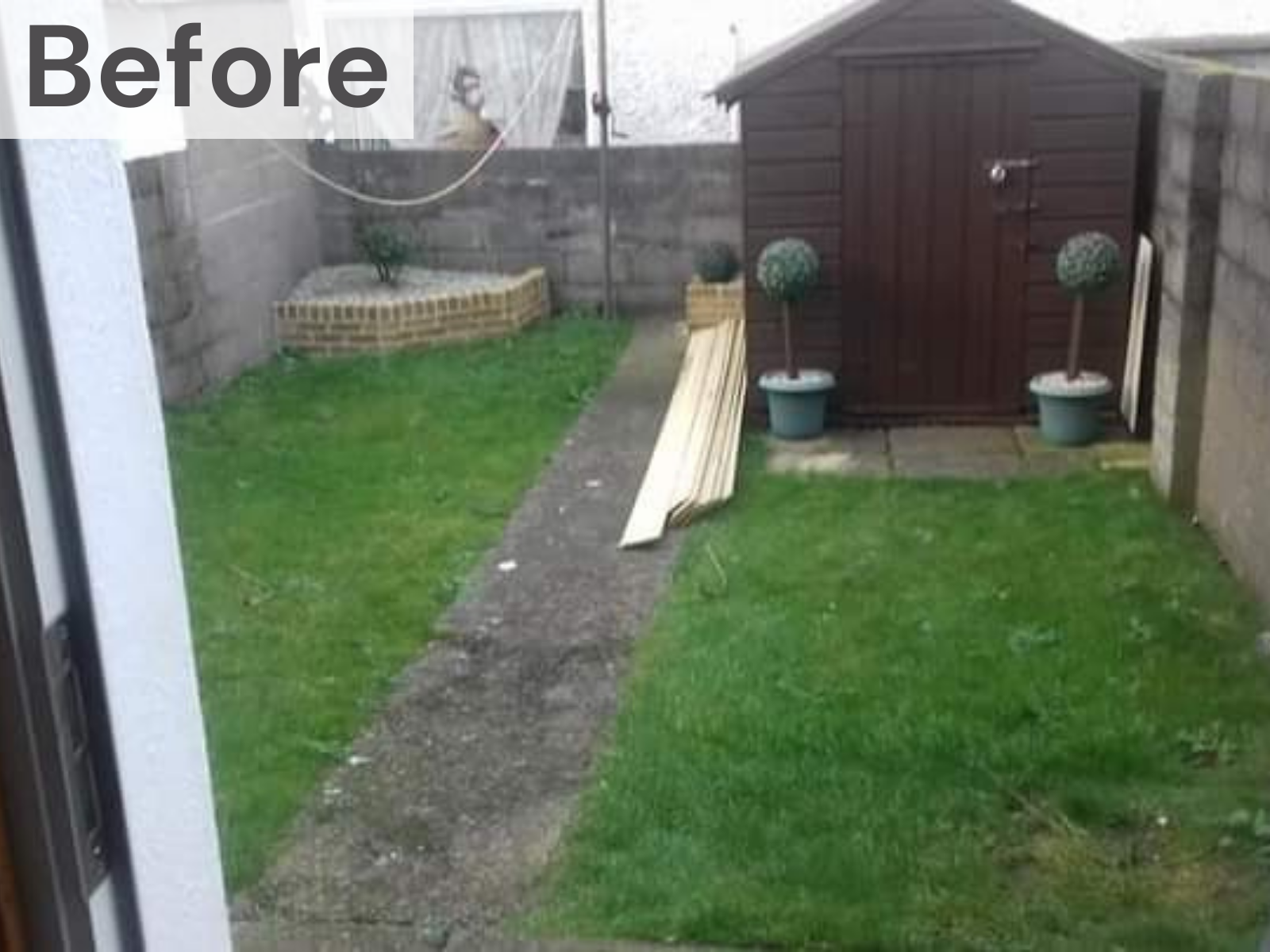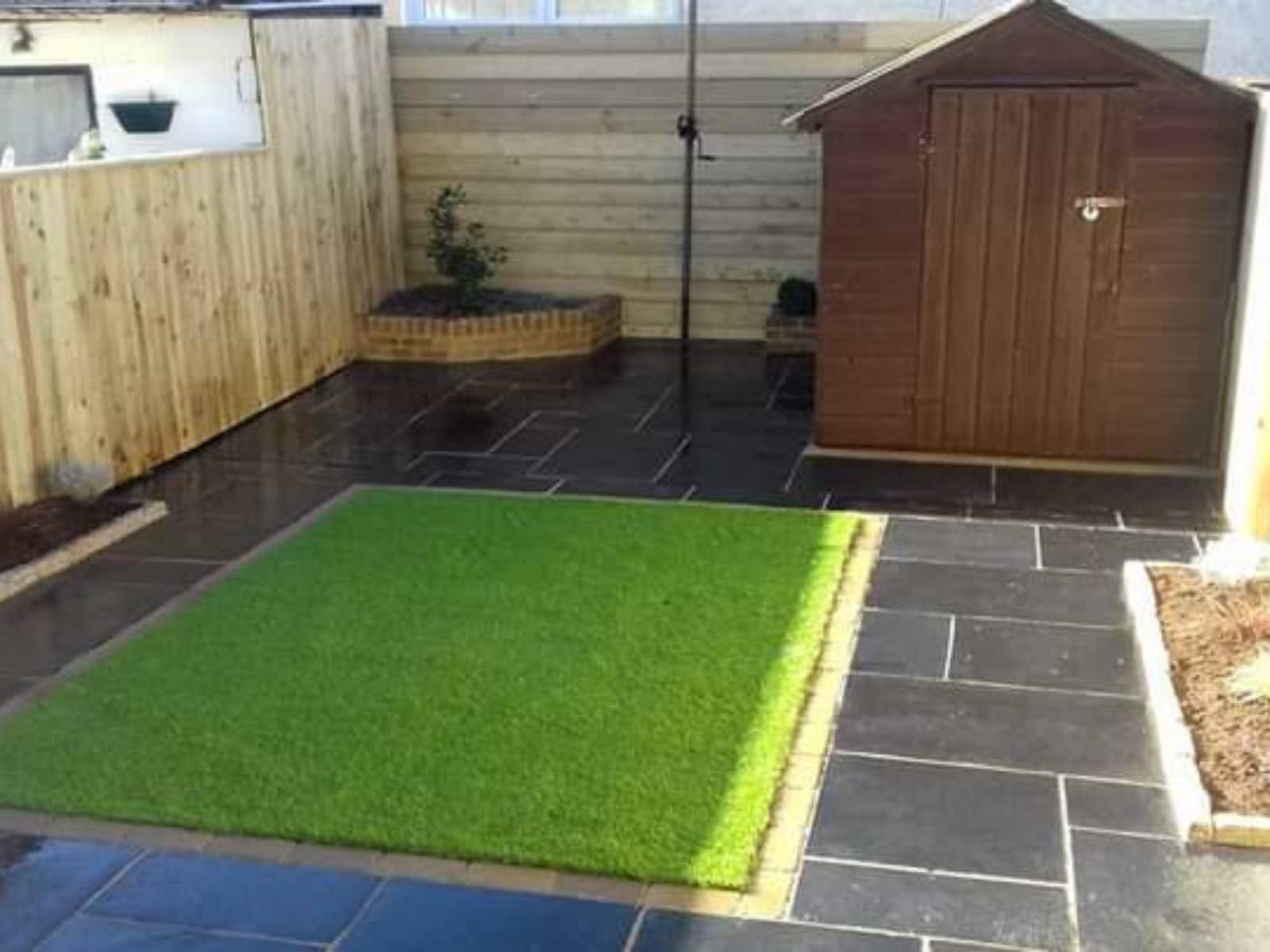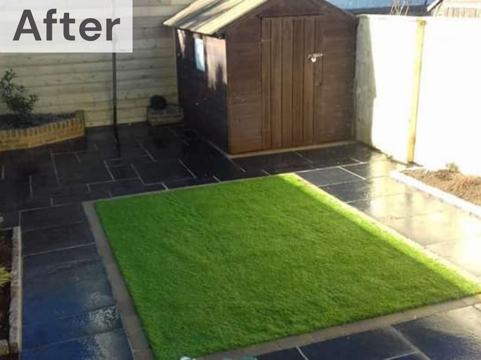 Maintenance free garden makeover with black limestone paving, beige granite edging, paneled treated fencing, artificial grass and soft planting including grasses/heathers. During works, our team channeled drains to resolve drainage issues in the garden