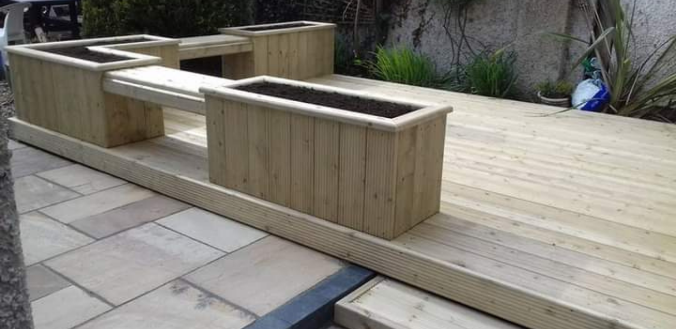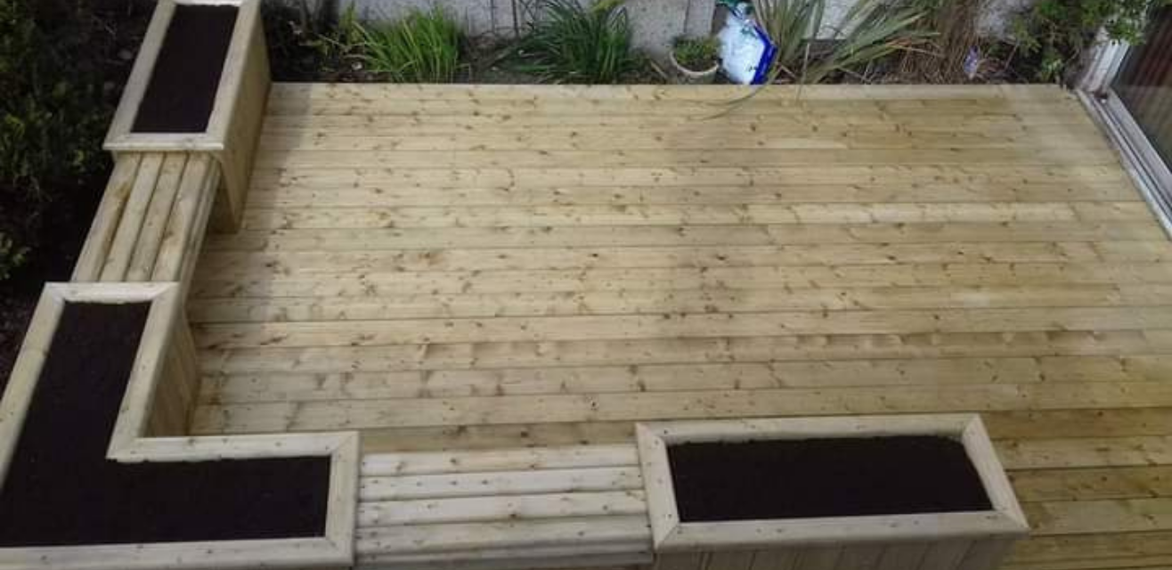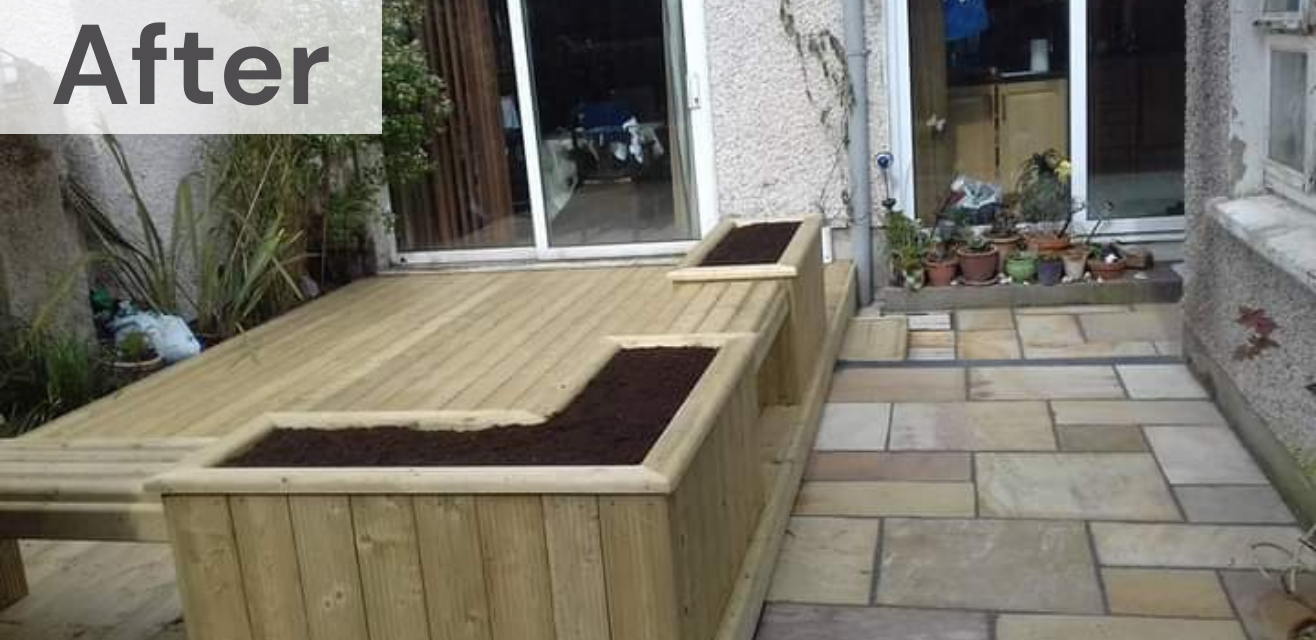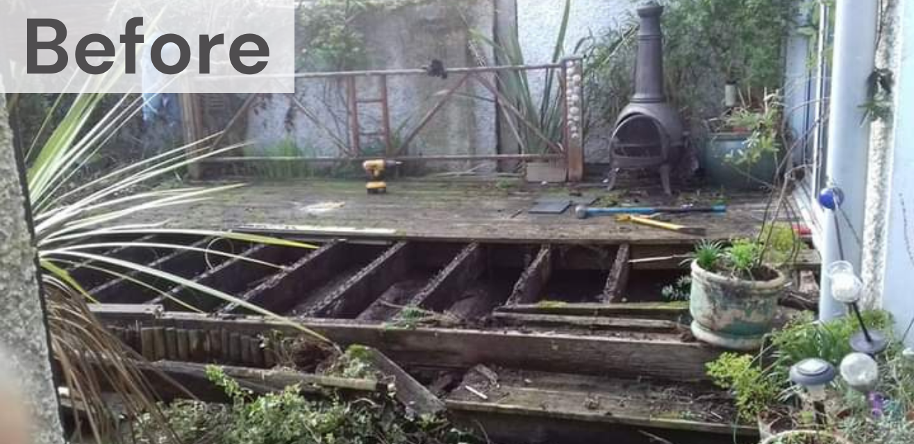 This rotted decking was a hazard and was in urgent need of renovation. Our team stripped the old decking out and replaced it with a new mint sandstone walkway and softwood deck